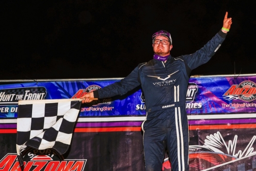 Carson Ferguson of Lincolnton, N.C., led all but the opening lap for a dominating opening night performance in the 35th annual Blue-Gray 100, earning $8,022 in Hunt the Front Super Dirt Series action at Cherokee Speedway. Ferguson beat seventh-starting Hudson O'Neal by 0.490 of a second for his first win of the season and first special event in more than a year.