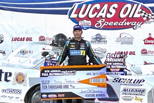 What won the race: Leading all but the first lap, Tony Jackson Jr. of Lebanon, Mo., turned back a late challenge from Chris Simpson for a $10,000 Fall Nationals victory at Lucas Oil Speedway. Jackson, who led comfortably until a late-race caution, took the checkers 0.557 of a second ahead of Iowa invader Chris Simpson in the weekend finale for unsanctioned Super Late Models.