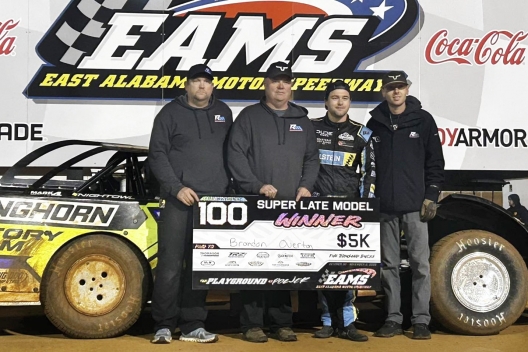 What won the race: Taking command from pole-starting Tyler Erb on the 18th circuit, Brandon Overton of Evans, Ga., paced the rest of Friday's 30-lap National 100 first preliminary feature at East Alabama Motor Speedway. The two-time event winner took the checkers 1.273 seconds ahead of Mark Whitener for the $5,000 payday and his fourth overall feature win of the season.