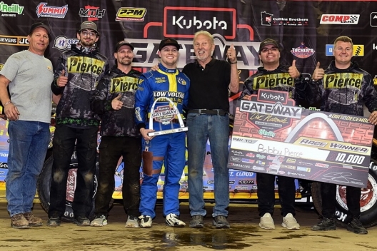 Taking advantage of his team winning the Hellraizer Jacks Pit Stop Challenge, Bobby Pierce of Oakwood, Ill., took command for good on lap four and never looked back for his third career prelim victory Thursday at the Kubota Gateway Dirt Nationals presented by O'Reilly Auto Parts and fifth overall triumph inside The Dome at America's Center.