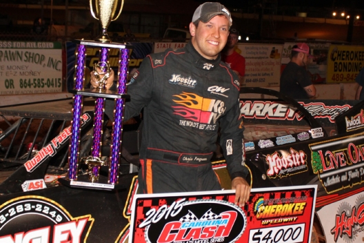 What won the race: Second-starting Chris Ferguson of Mount Holly, N.C., overtook polesitter and teammate Josh Langley of Lancaster, S.C., with four laps remaining Saturday at Cherokee for his second Carolina Clash victory of 2015. Langley, his brakes failing in just his fourth Super Late Model start, settled for second.