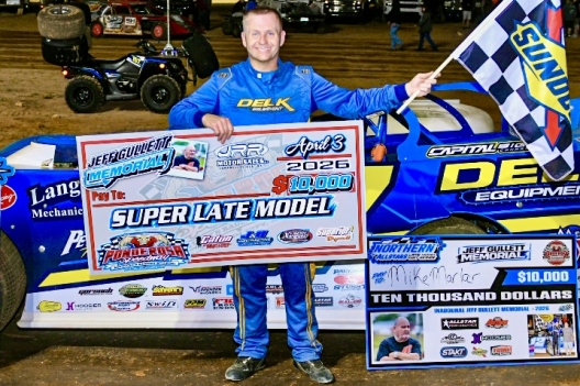 What won the race: Overtaking Michael Chilton exiting the turn-four cushion on lap 26, fifth-starting Mike Marlar of Winfield, Tenn., led the rest of Friday's 50-lap Jeff Gullett Memorial at Ponderosa Speedway. Marlar beat Jason Jameson by 1.396 seconds for the $10,000 payday, his fourth career Northern Allstars Late Model Series victory and first in nearly 19 years.