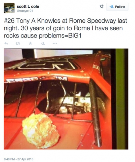 In a race that was later won by Derek Ellis of Chatsworth, Ga., Knowles finished 17th. Despite the large size of the rock that hit his car, Knowles said he walked away with only bruises, with the damage to his car mostly limited to the windshield. However, the turn of events made for a night Knowles won’t soon forget.
